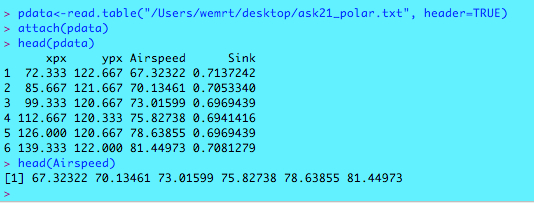 The first line is “pronounced”, “Read the data table ask21_polar.txt into a variable named pdata. The first line of the data table contains the column names.” Of course “/Users/wemrt/desktop/ask21_polar.txt” is particular to my machine. The attach function gives us the ability to access each column of data by the column name and the head function just displays the beginning of whatever is within its parenthesis.