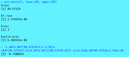 The various numbers are where the function is “equal to zero”, the value of the function when it’s evaluated at that value, the number of attempts uniroot took to find the solution and a measure of the precision of the answer (smaller is better). As you can see 89.67529 doesn’t exactly evaluate to zero but 1.376554×10^-6 which is pretty close. If we wanted to get a more precise answer, for some twisted reason, there’s a tolerance parameter we could pass to uniroot to tell it to continue searching until it’s met the tolerance.