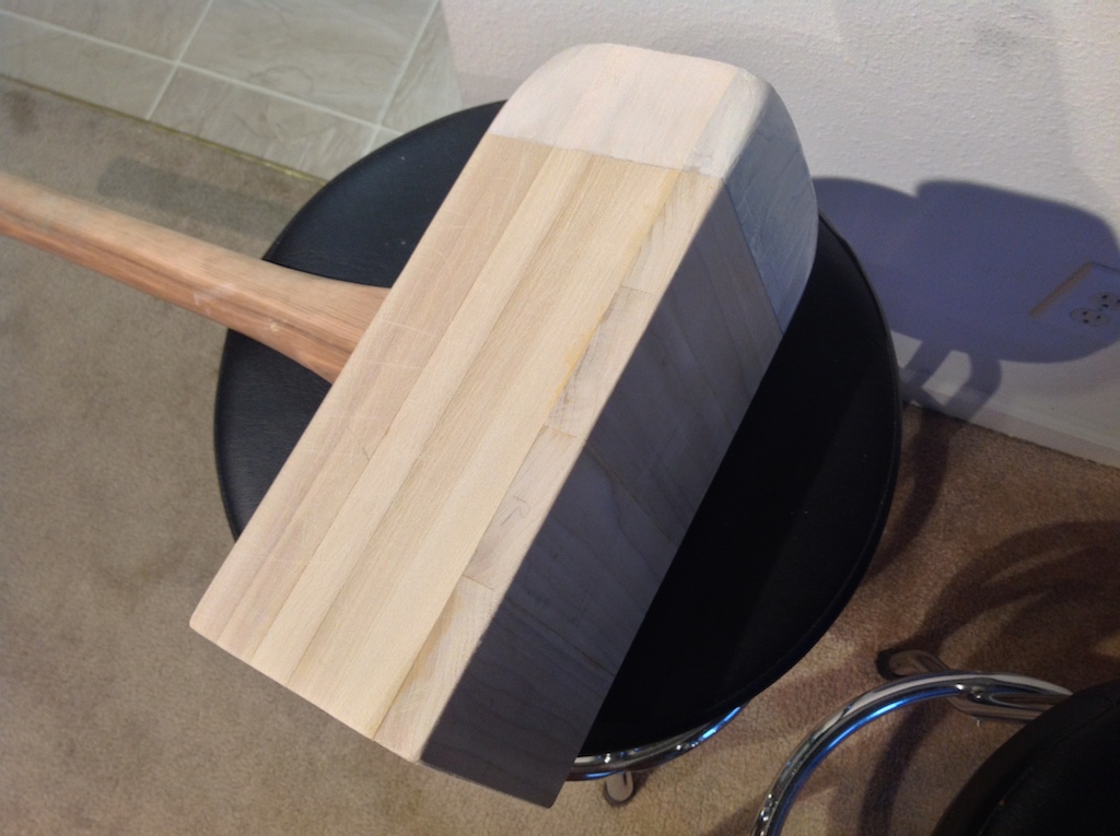 Easier to see in this shot is the rounding I did on corners. There’s nothing fancy here, just mark an arc using the bottom of a glass at each corner of the face and use the rasp to round the corners. You’ll also want to use a bit of sandpaper to round over all the sharp edges. I wanted to add a bit of strength to the striking surface – I was concerned about the wood splitting along the grain – so I used painters blue tape to mask off the front of the hammer and applied a coat of marine epoxy using a foam brush. I removed the blue tape once the epoxy was partially cured.