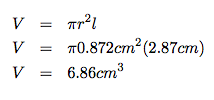 Since the bore is a cylinder and the cork on the neck should be filling the void between the neck proper and the mouthpiece I’m going to treat the section of neck inserted into the mouthpiece as a cylinder. When I’m in tune about 2.87 cm of neck is inserted into the mouthpiece and the bore has a radius of 0.872 cm so the volume of neck inserted into the mouthpiece is: