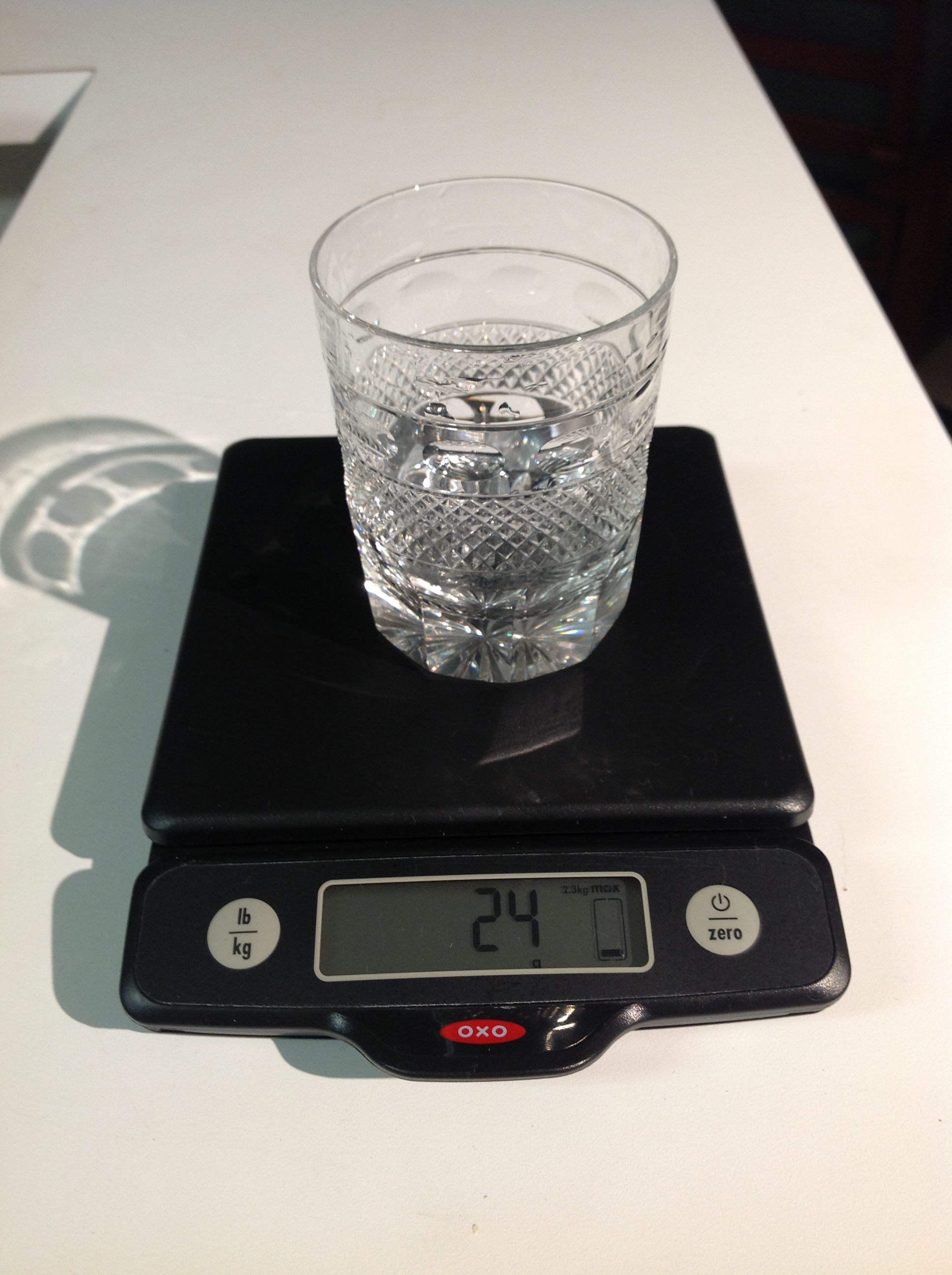 The container used on the scale was my Waterford crystal whiskey glass. Covering the bore hole and filling the mouthpiece through the window won’t work since the side rails curve. Instead I gave the table, front, and side rails a light coating of olive oil (extra virgin) and pressed a business card onto the the mouthpiece like so: