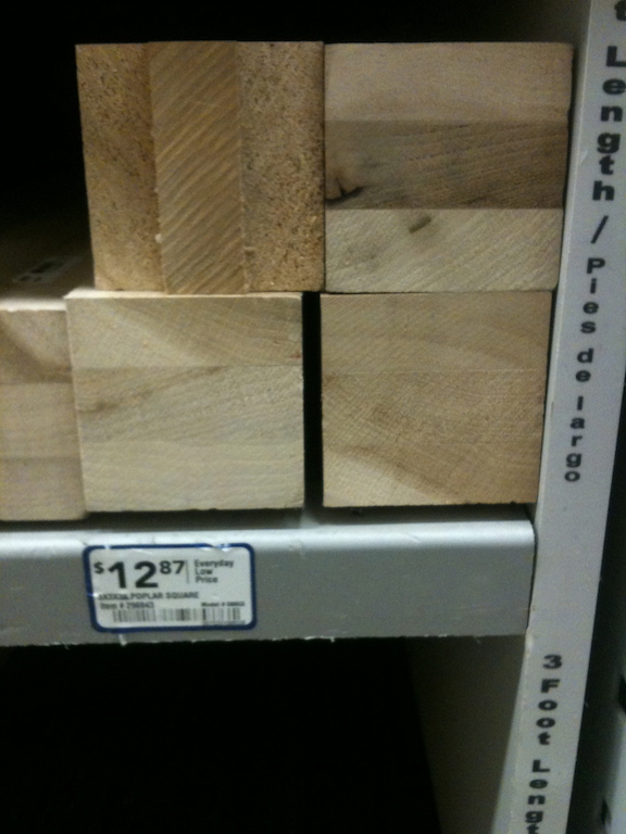 In the specialty wood section I found pre-laminated pieces of 3X3 inch poplar, 36 inches long. They also carried the same size of wood in oak for around $5 more per piece. Go for the oak if you’re flush with cash but be warned, if you’re using hand tools you’re looking at more work. They also carried 1X3 in poplar which I needed to build up the size of the hammer head and provide some extra strength. (Click on the thumbnails to see the full sized image.)
