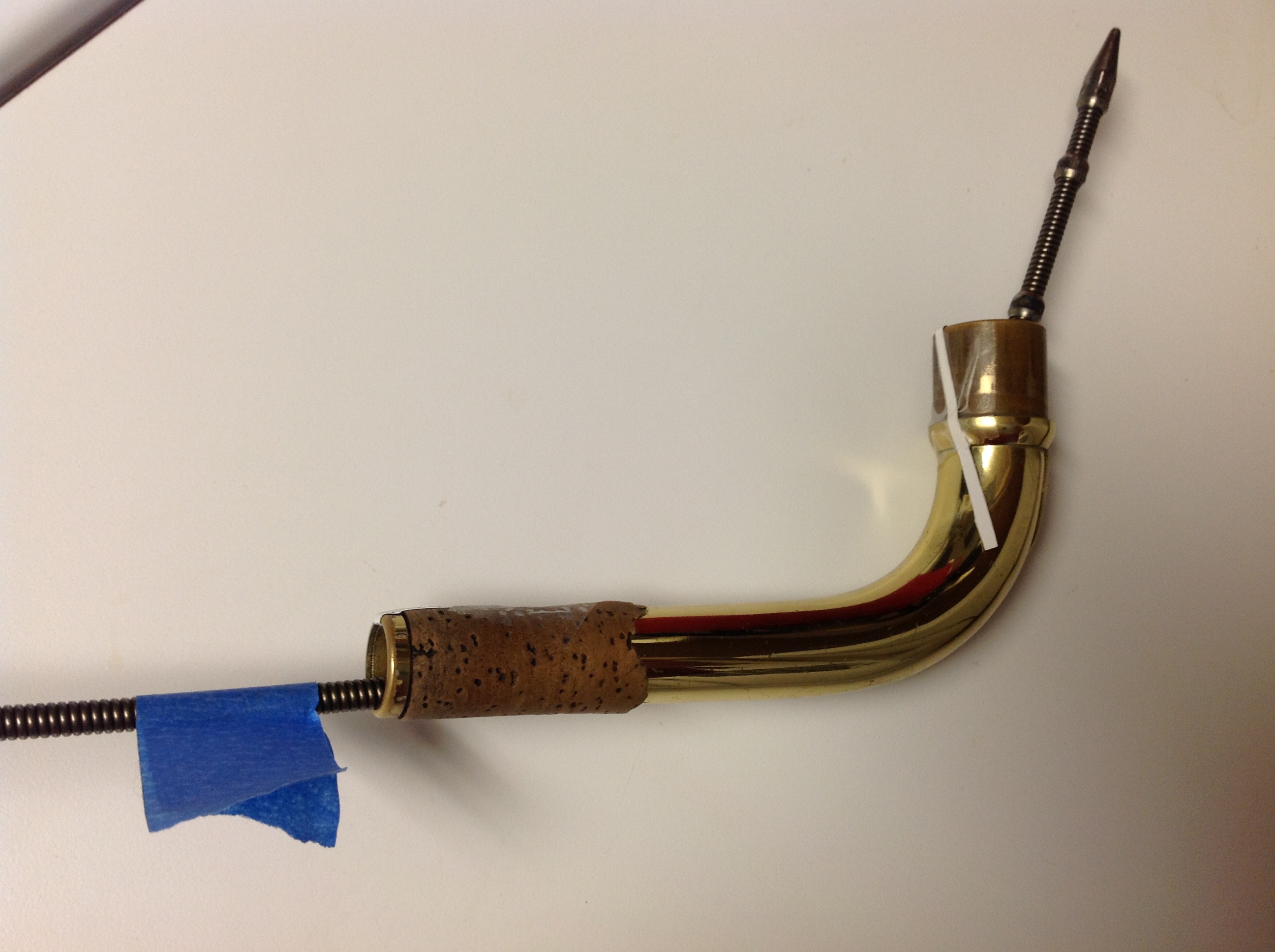 The bottom length is fairly easy to measure. I sliced a thin strip of paper from the back cover of the U.S. Navy’s 36th International Saxophone Symposium schedule book. It’s a nice heavy paper that’s strong but still pliant. This strip was then fed through the neck and the excess on the socket side folded over and taped. The strip was then pulled tight out through the mouthpiece side, folded over and taped. A light shined from both ends confirmed that the strip was laying flat along the bottom side of the neck. A single edged razor was then used to guillotine the strip even with the neck openings. This strip measured 15.8 cm in length.