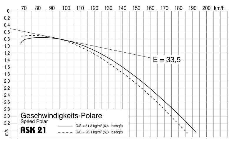 What we need at this juncture is a set of data points off of a published polar curve. Luckily the Caesar Creek Soaring Club in Waynesville, OH (A big shout-out of thanks to them!) has published the spec sheet on the ASK-21. You can view it here.