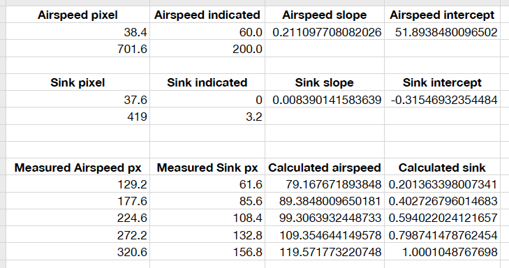 | Measured Airspeed px | Measured Sink px | Calculated airspeed | Calculated sink | |