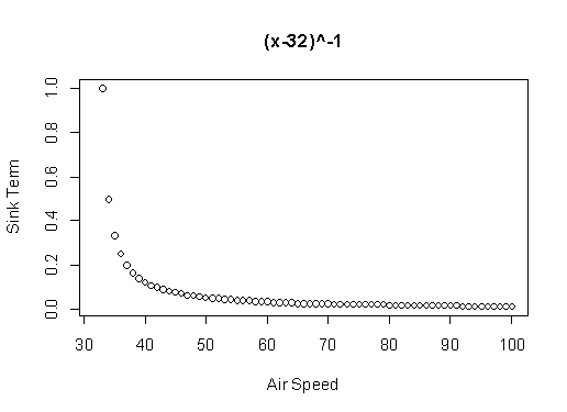 Now with that said I am going to use one aircraft specific number – stall speed. I don’t feel too bad about this because it’s an easy value to find, as opposed to a value like the wing span efficiency value or the sailplane’s drag coefficient. The term built using the stall speed looks like the title on the following graph which assumes a stall speed of 32kts: