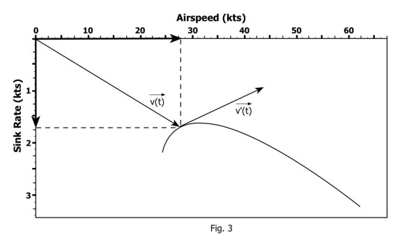 By now the sailplane pilot’s minds have run ahead and realized that if v(t) in figure 3 moves to the apex of the curve that v'(t) will be horizontal giving a slope of zero and defining the minimum sink speed.