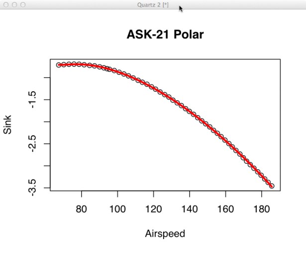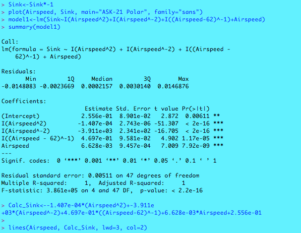 The next step is to use linear modeling to find the coefficients (A, B, C, etc.) in our model equation. So that we remain consistent with the factory polar the first thing we need to do is make all the sink rates negative by multiplying them by -1 (see the R log below). Then plot the raw data and give it a title of “ASK-21 Polar”. Since I’m using an OS X machine I have to add the ‘family=”sans”‘ parameter to the plot function to get the axis labels to appear. Yes, as far as I’m concerned, this is a bug. The plot is shown below with the raw data and best fit plotted on it.